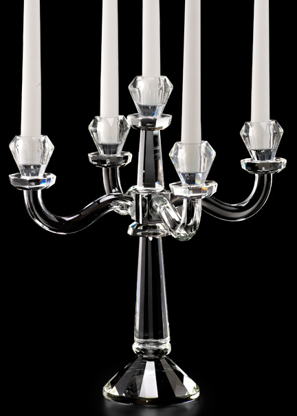 14in Crystal Diamond Candelabra This crystal candelabra features faceted glass all over, including faceted crystal, diamond shaped candle cups. It is a great size for an intimate dinner table at home, on a restaurant table, or tables at a small wedding.
