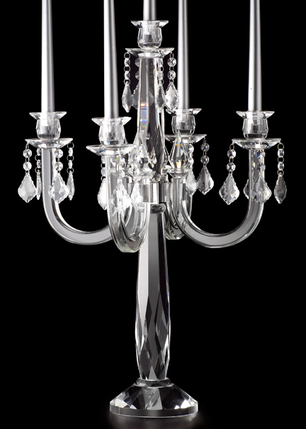 24 1/2in Chandelier Ornament Crystal Candelabra Add a classic touch to your tables at a dinner, wedding reception, or event, with this Chandelier Ornament Crystal Candelabra. Faceted, hanging crystal ornaments, the faceted cups, stem, and base, all sparkle as they catch lights cast on them. Use Sure-Stik to secure candles in place.