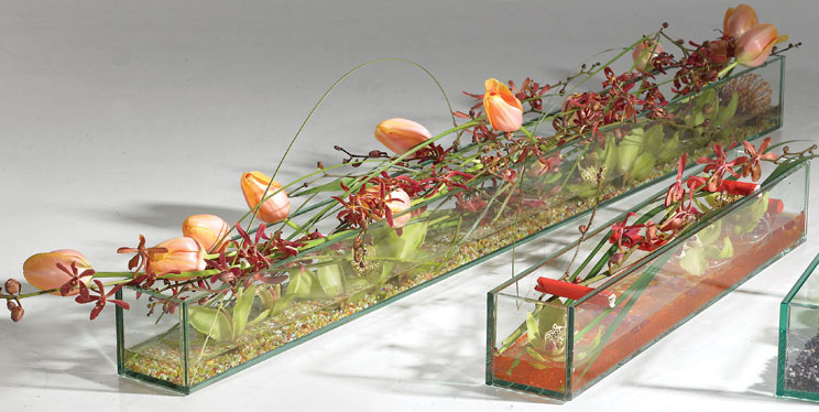 This long, rectangular vase can hold varying sorts of displays. Use to arrange bulbs and blossoms; petite plants; candles; layered rocks, gems or sand; or floating displays. This glass trough is ideal for long tables or stands, and will complement runners of a similar shape. It is 47.5" long, 4" wide, 4" tall.