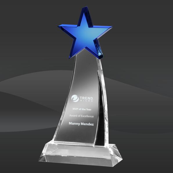 Aqua Star Crystal Award (MPI-CR-A1049BU-10) (Sizes: 10.25" Tall Only) MPI Crystal Info: The Aqua Star Crystal Award features a blue crystal star mounted in on a clear crystal stand and base. Elegant presentation box included.