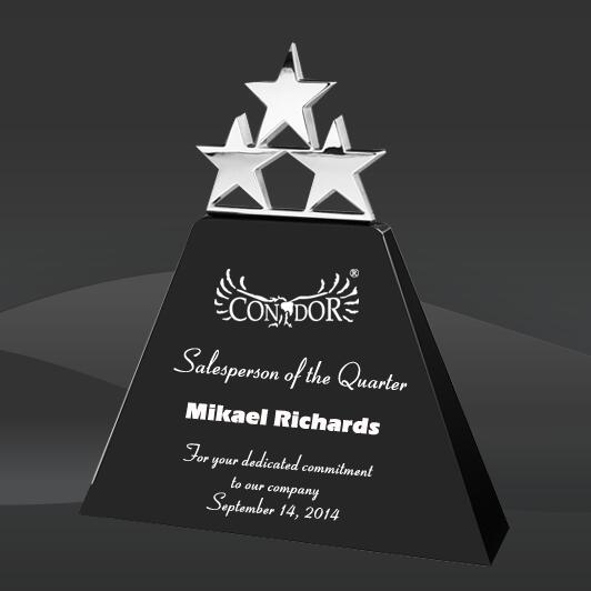 Black Triple Star Crystal Award (DMC-DCS381, DMC-DCS382, DMC-DCS383) (Sizes: 5", 7", 9" Tall) Crystal Info: The Black Triple Star Crystal Award features a black crystal pyramid wedge with three silver dancing metal stars on top. Comes in 3 sizes with an elegant black presentation case.