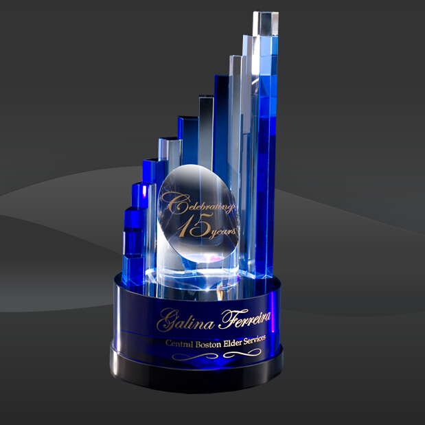 Blue Aerial Crystal Award (T-NAER612) (Sizes: 12.25" Tall Only) Crystal Award Info: The Blue Aerial Crystal Award features clear and blue rectangles mounted on top of a blue crystal base and oval crystal centerprice. This award comes packaged inside of an elegant presentation case.