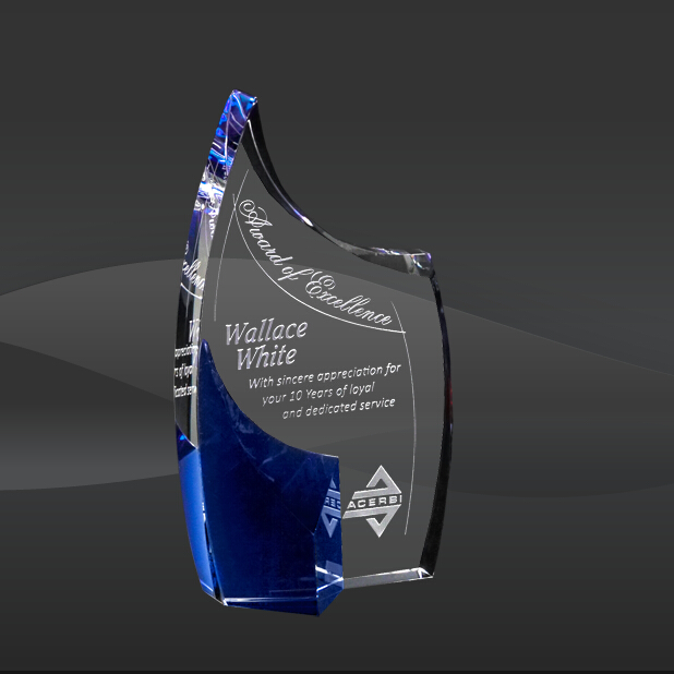 Blue Allure Crystal Award (CD-6765, CD-6766, CD-6767) (Sizes: 7", 8", 10" Tall) Product Description: The Crystal Blue Allure Award features an abstract design that combines brilliant blue crystal with optically clear crystal. This award comes in 3 sizes and an elegant presentation box.
