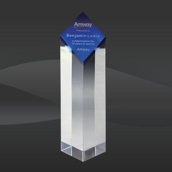 Blue Diamond Splash Crystal Award (DMC-SCA301B, DMC-SCA302B, DMC-SCA303B) (Sizes: 5", 7", 10" Tall) Crystal Info: The Blue Diamond Splash Crystal Award features a clear crystal self standing tower with blue crystal diamond tint on top. Comes in 3 sizes with an elegant black presentation case.