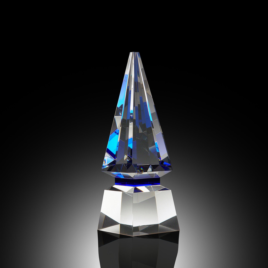 A marriage of blue and translucent polished crystal makes this crystal steeple a stunning achievement of success. The Blue Spire Crystal Award sits on top of a multi-dimensional crystal base that can be engraved with messages of appreciation for employees aspiring towards excellence. An opulent crystal employee recognition gift that will be admired by all.
