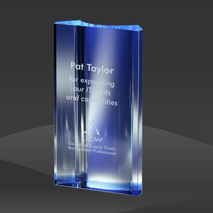 Blue Twin Peaks Crystal Award (MPI-CR-A1044BU-8) (Sizes: 8.5" Tall Only) MPI Crystal Info: The Blue Twin Peaks Crystal Award features a clear crystal with curved back and blue accent that reflects throughout. Elegant presentation box included.