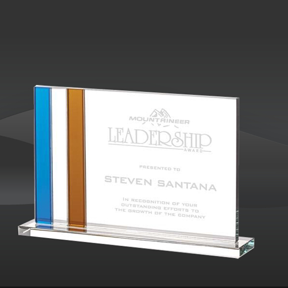 Blue & Orange Stripe Crystal Award (MP-AWS7701, MP-AWS7702, MP-AWS7703) (Sizes: 8", 9", 11" Wide) Award Info: The Blue & Orange Stripe Crystal Award features a clear crystal rectangle with light blue and amber orange stripe on the left side, mounted onto a clear crystal base. Elegant presentation box included.