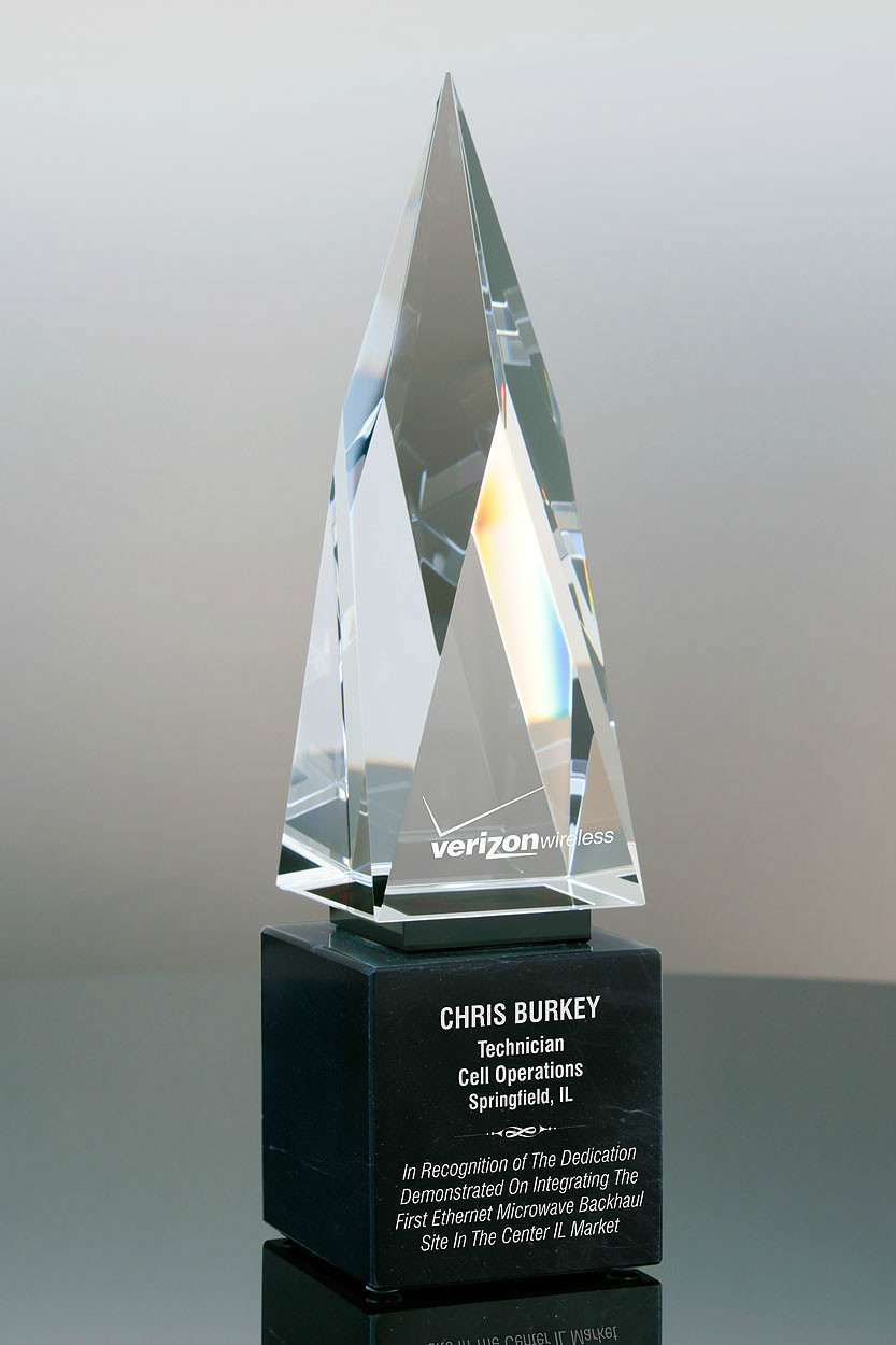 Reminiscent of a mountain peak, this award has many beautiful facets on the top and handsome black marble at the base. This award is definitely impressive at 11 3/8" tall and 5.5 lbs each.