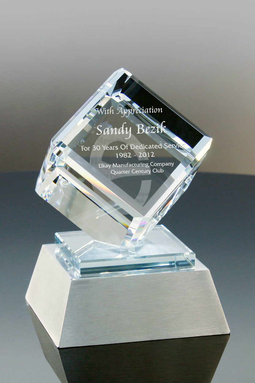 The Cachet Clipped Cube Award is a uniquely shaped award and will be sure to impress your recipientst. The clear crystal cube rests on one of its corners, atop a beautiful brushed aluminum base with a glass accent piece..
