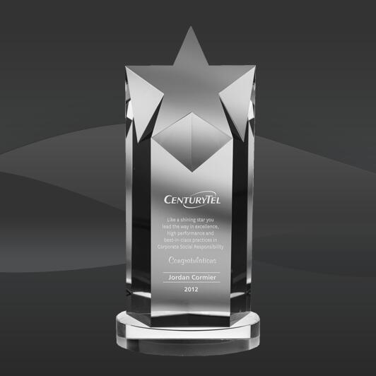 Clear Crystal Rising Star Award (JC-7101-963, JC-7102-963, JC-7103-963) (Sizes: 7", 9", 11" Tall) Description: The Clear Crystal Rising Star Award is a clear crystal flat face crystal star, mounted on a clear crystal oval base. Comes packaged inside of an elegant blue and silver presentation box.