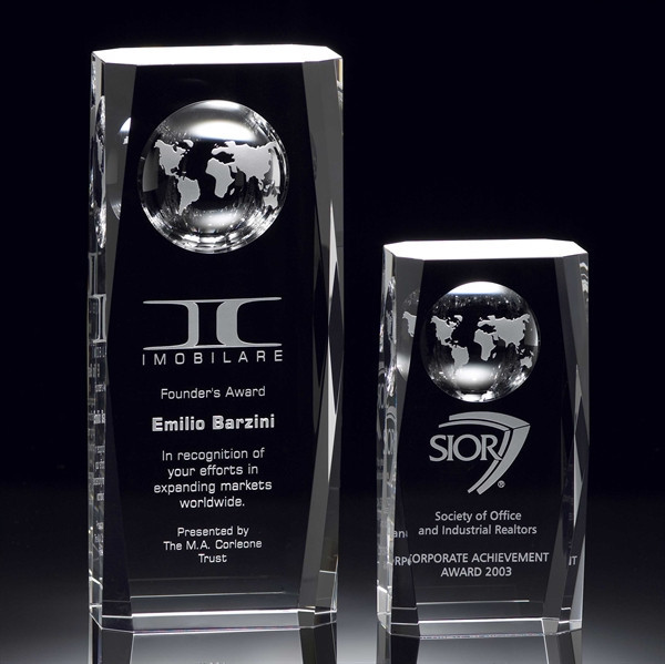 For individuals who accomplish feats of global magnitude, the Crystal Globe Elite Column is the ideal selection. Reverse-etched continents produce a floating 3-D globe affect inside a hefty 2 1/2" thick column. Beveled edges bring additional flair to the face of the column where you can engrave messages of gratitude, logo designs, or custom artwork.