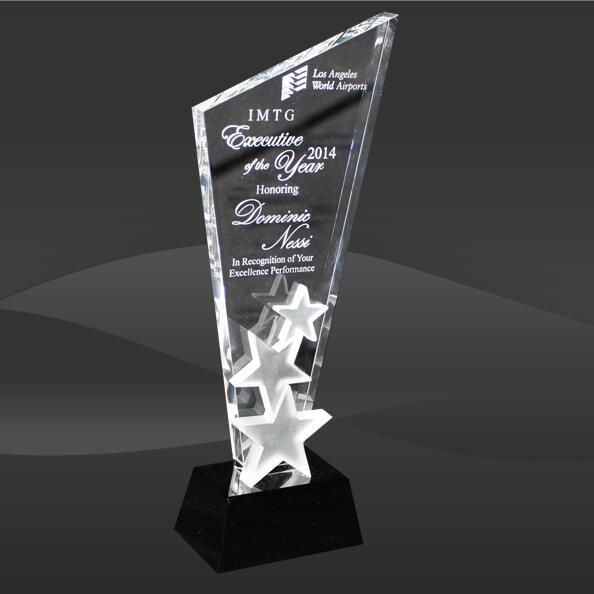 Crystal M.C. Hollywood Award (T-SMC309, T-SMC311) (Sizes: 10", 12" Tall) Crystal Info: The Crystal M.C. Hollywood Award features a pointed optic crystal rising peak with three frosted stars on the bottom. Award is mounted onto a black crystal base. Comes inside of an elegant presentation case.
