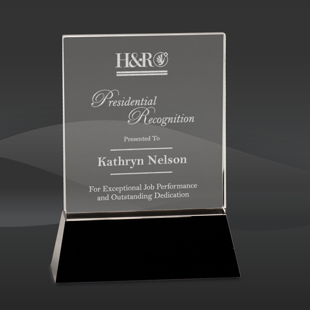 Crystal Rectangle on Black Base Award (J-CRY6901S, J-CRY6901L) (Sizes: 8", 9" Tall) Crystal Info: The Crystal Rectangle on Black Base Award features a crystal rectangle wedge shape billboard mounted on a black crystal base. Comes in 2 sizes and packaged in an elegant blue presentation case.