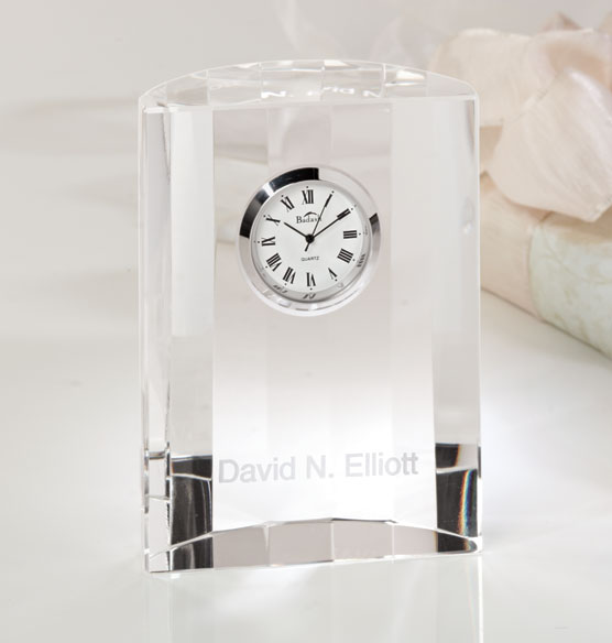 Personal Accessories Desktop & Office Commemorate a graduation, promotion, retirement or other milestone with this traditional symbol of success, an engraved crystal desk clock. Roman numerals add an elegant detail on the face, and facets on the rear catch light beautifully. The petite size makes this clock easy to display almost anywhere. Features 100% lead-free crystal Analog quartz clock Silver tone trim Roman numerals Hour, minute and second hands Battery is included Half moon shape 3 1/2" wide x 4 1/2" high x 1" deep