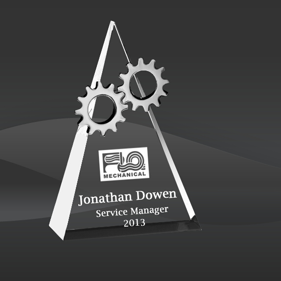 Crystal Triangle Gears Award (CIP-YJ138S) (Sizes: 8", 10" Tall) Achievement Awards Crystal Description: The Crystal Triangle Gears Award Plaque features a self standing optical crystal Triangle with Stainless Steel Gears on top. This Crystal Award is shipped in an elegant red presentation box.