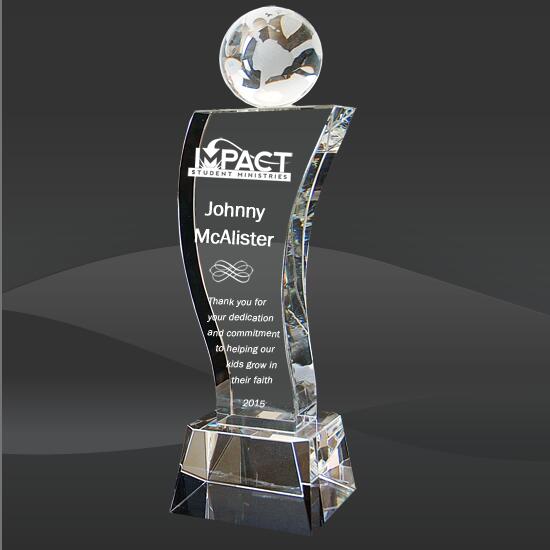 Crystal Wave Globe Award (SCT-3351-GL, SCT-3352-GL, SCT-3353-GL) (Sizes: 9", 11", 13" Tall) Crystal Info: The Crystal Wave Globe Award features an optic crystal wave award with a clear round crystal globe on top, mounted onto a clear crystal base. Comes packaged inside of an elegant presentation case.