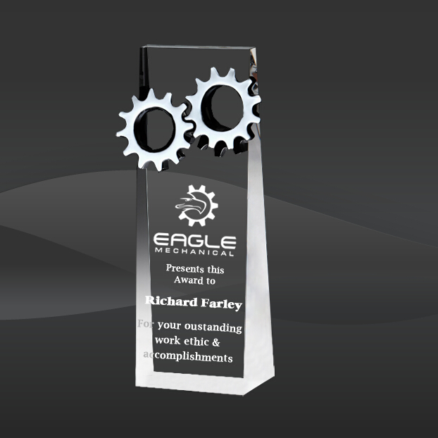 Crystal Wedge Gears Award(CIP-YJ140S) (Sizes: 8", 10" Tall) Crystal Description: The Crystal Wedge Gears Tower Plaque features a self standing optical crystal wedged tower with gears on top. This Crystal Award is shipped in an elegant presentation box.