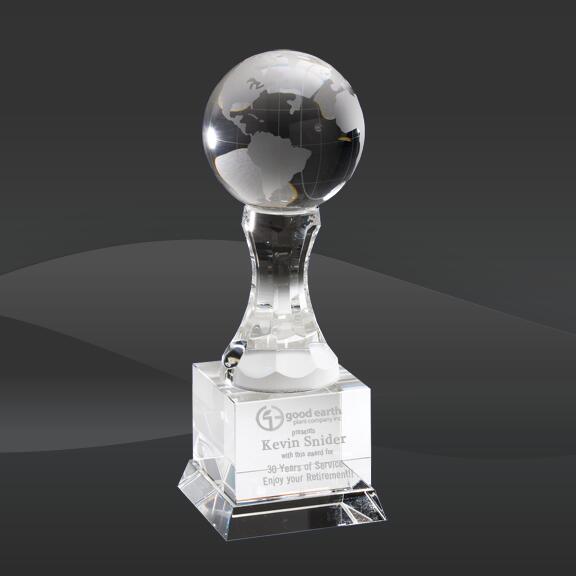 Crystal World Pillar Award (D-CRY158) (Sizes: 9" Tall Only) Description: The Crystal World Pillar Award features a round world globe mounted on a crystal pedestal and base. Award is packaged inside of an elegant presentation box.