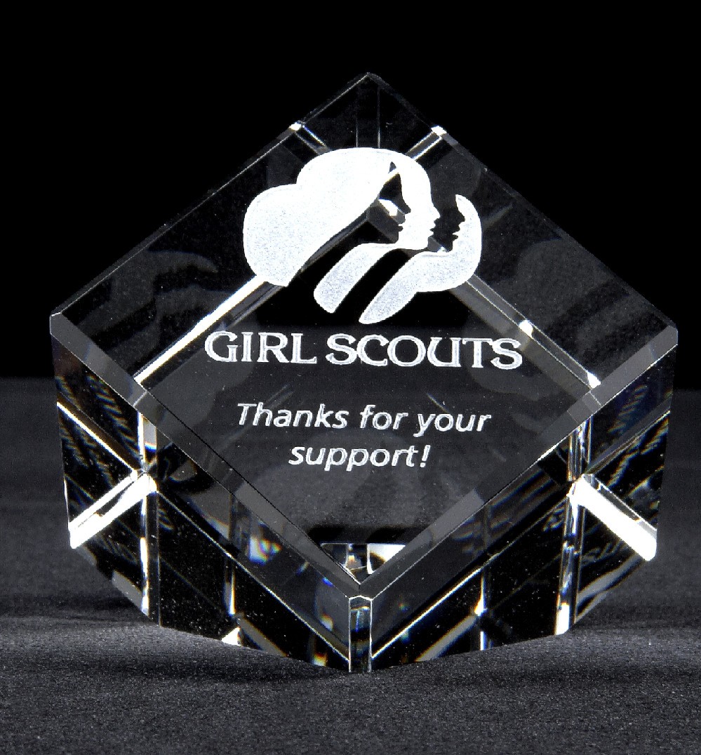 Features: A totally awesome gift, the Deco Cube Paperweight makes a unique and eye-catching presentation. Starting with a simple crystal cube, beveled edging is added to give a finished look. The cut corner allows the Deco Cube to be displayed solidly on a desk or in a curio cabinet. The three available sizes make this item a very versatile corporate gift.