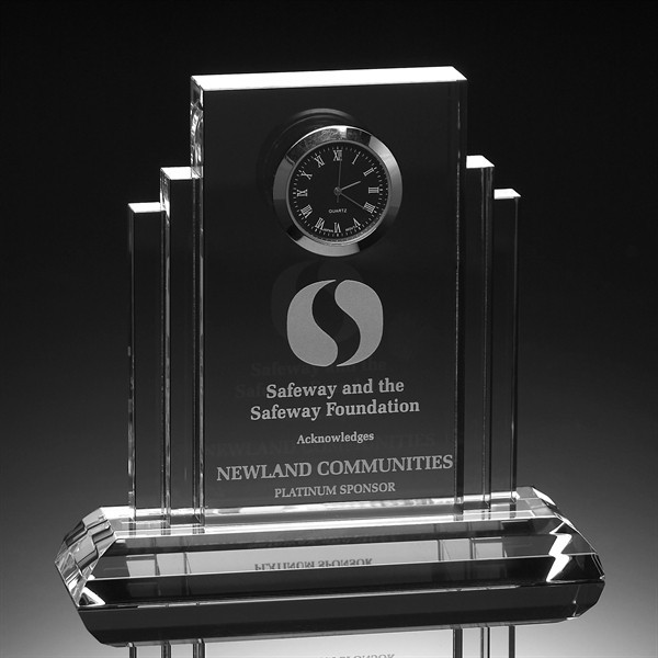 An impressive award for corporate sponsorship or an employee retirement gift, the Echelon Crystal Clock is a handsome recognition gift to present colleagues and strategic partners. A solid base with ascending columns of crystal frame a crystal wedge for engraving a logo and message of acknowledgment. Generous discount pricing and complimentary engraving makes this personalized crystal clock award a favorite.