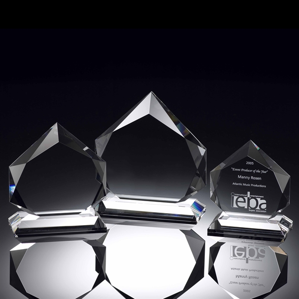 The precision-cut, beveled angles of the Eminence Crystal Trophy shimmer in the light to illuminate the crowning achievements of your recipients. This seven-sided polygon is artistically balanced and provides a generous engraving area to recognize high achievers and stellar performers in your organization. Crafted of polished optical crystal, this recognition trophy deserves prominence at your award ceremonies.