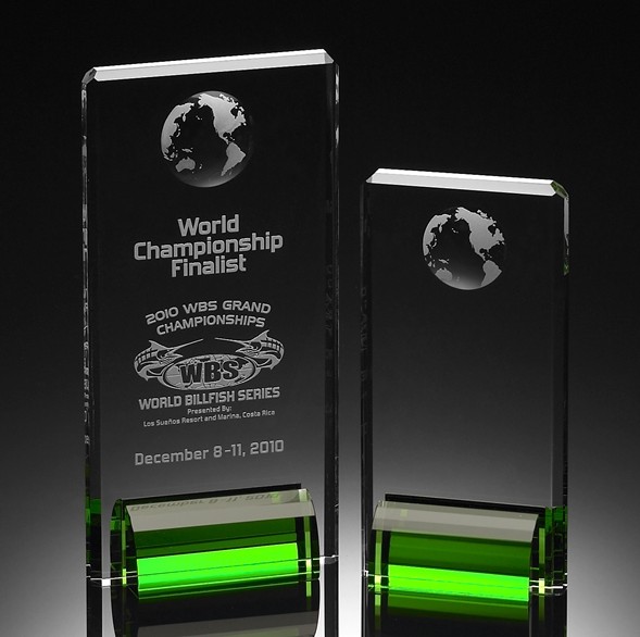The Evergreen Globe Tower Crystal Award is available in two sizes. This award has a simple design with a large engraving area for a powerful message and your logo. The crystal tower is held upright by two pieces of green crystal. The continents are engraved inside a dimple on the back side of the award.