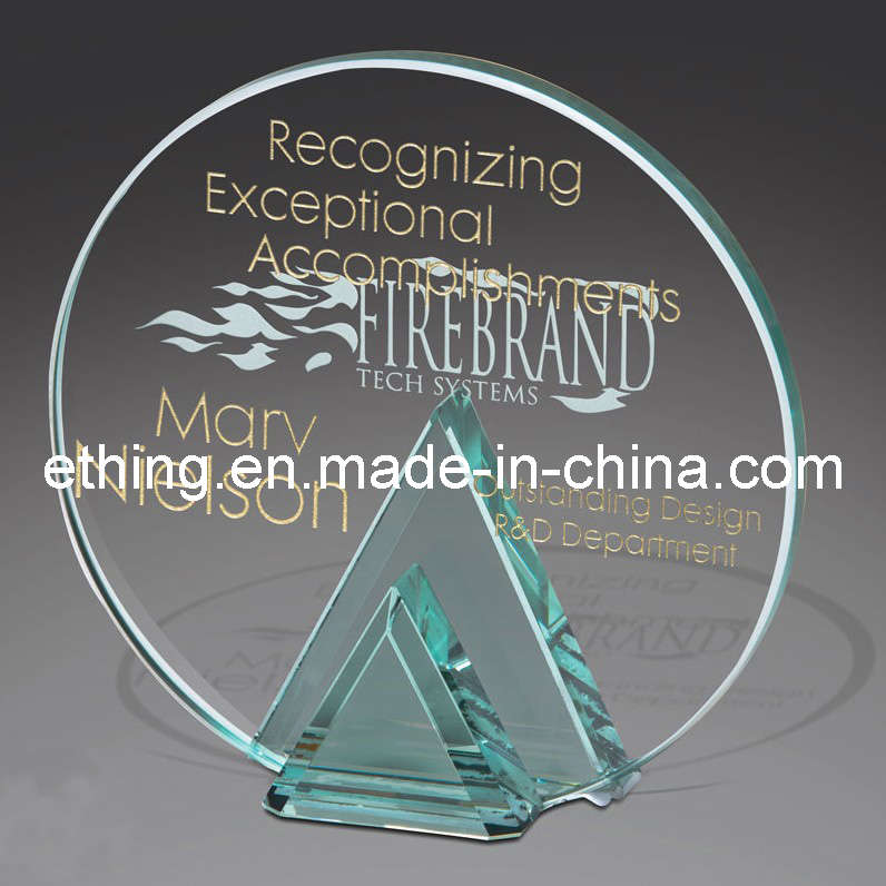 Moon shape award with two thick triangle shape glass bases on each side. Multiple angles and layers of thick glass create the glistening brilliance of this collection. The shear elegance shines brightly when paired with skillfully etched custom messages of appreciation. Mix geometrical shapes in an exceptional style makes them beautiful from all angles. It has the color of jade glass.