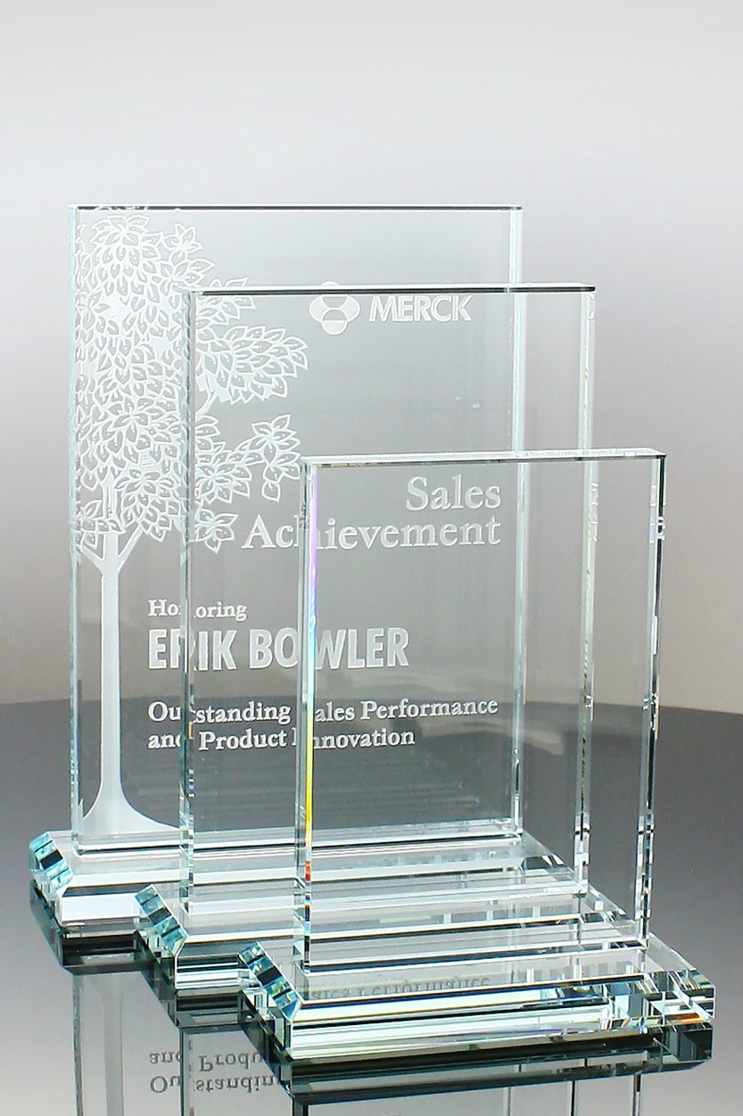 The Right Angle Glass Award is available in three sizes, 7, 9 and 10 inches tall and is crafted with ¾" thick glass. This award can be made in larger sizes or smaller sizes to meet your needs.