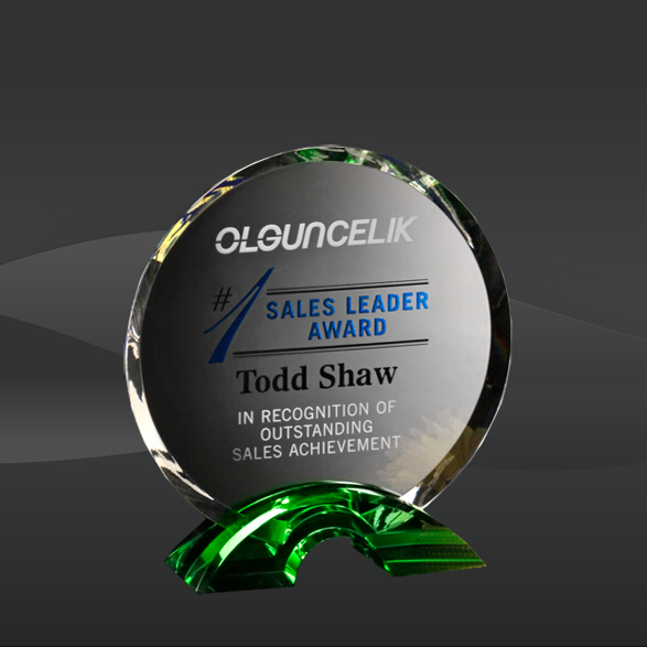 Greenbrier Crystal Circle Award (CD-4081, CD-4082, CD-4083) (Sizes: 6", 7", 8" Tall) Product Description: The Greenbrier Crystal Circle features an elegant optical crystal with a green emerald crystal base. This award comes in an elegant black gift box.