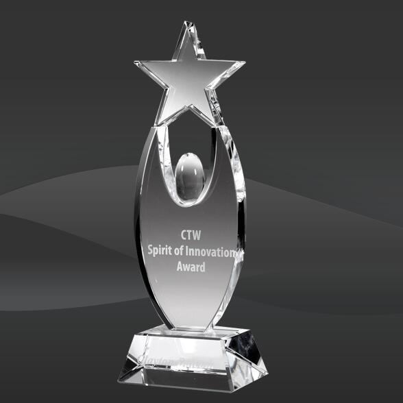 Inspirational Star Crystal Award (CBD-OCIS085, CBD-OCIS100, CBD-OCIS115) (Sizes: 8", 10", 11" Tall) Crystal Info: The Inspirational Star Crystal Award features a clear crystal star and base holding the star up, mounted onto a clear crystal base.