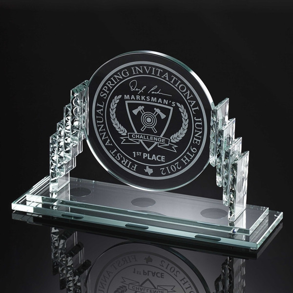 Our Jade Glass Corona award has the look and style of victory. A circular award with large engraving area is supported by pillars of tiered pearled glass and is adhered to a prestigious glass base. Deep glass etching brings a frosted appeal to congratulatory messages, artwork, and logo designs for individuals and teams of stellar accomplishment. The ideal corporate or team recognition gift for any awards ceremony.