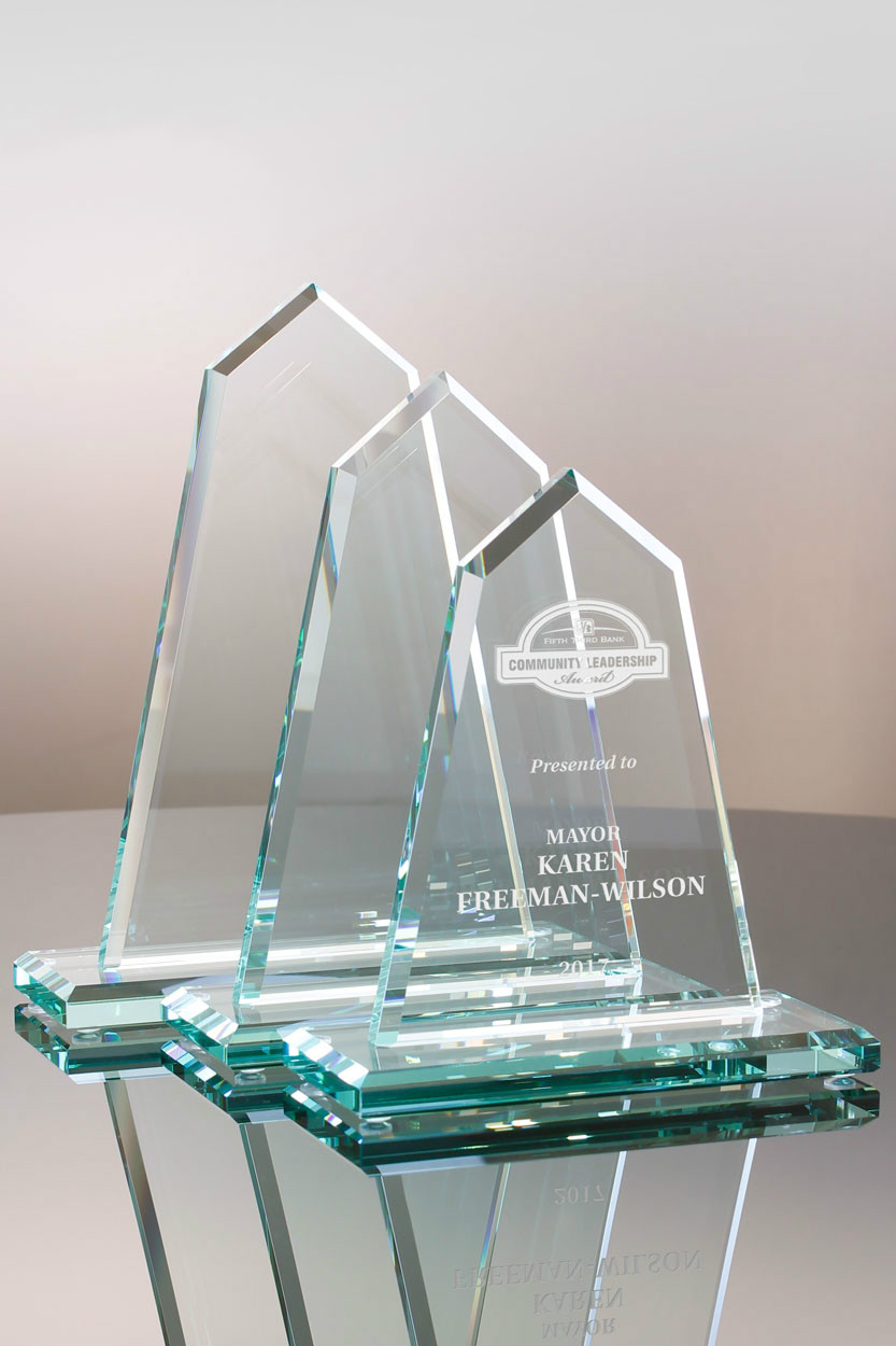 This award is available in three sizes: 6.5", 7.5" and 8.5" tall. It is a great option for award programs that need several sizes for various levels of achievement. The award can be gold or silver filled as well as engraved on both sides of the glass. Ask your Awards Consultant for details.