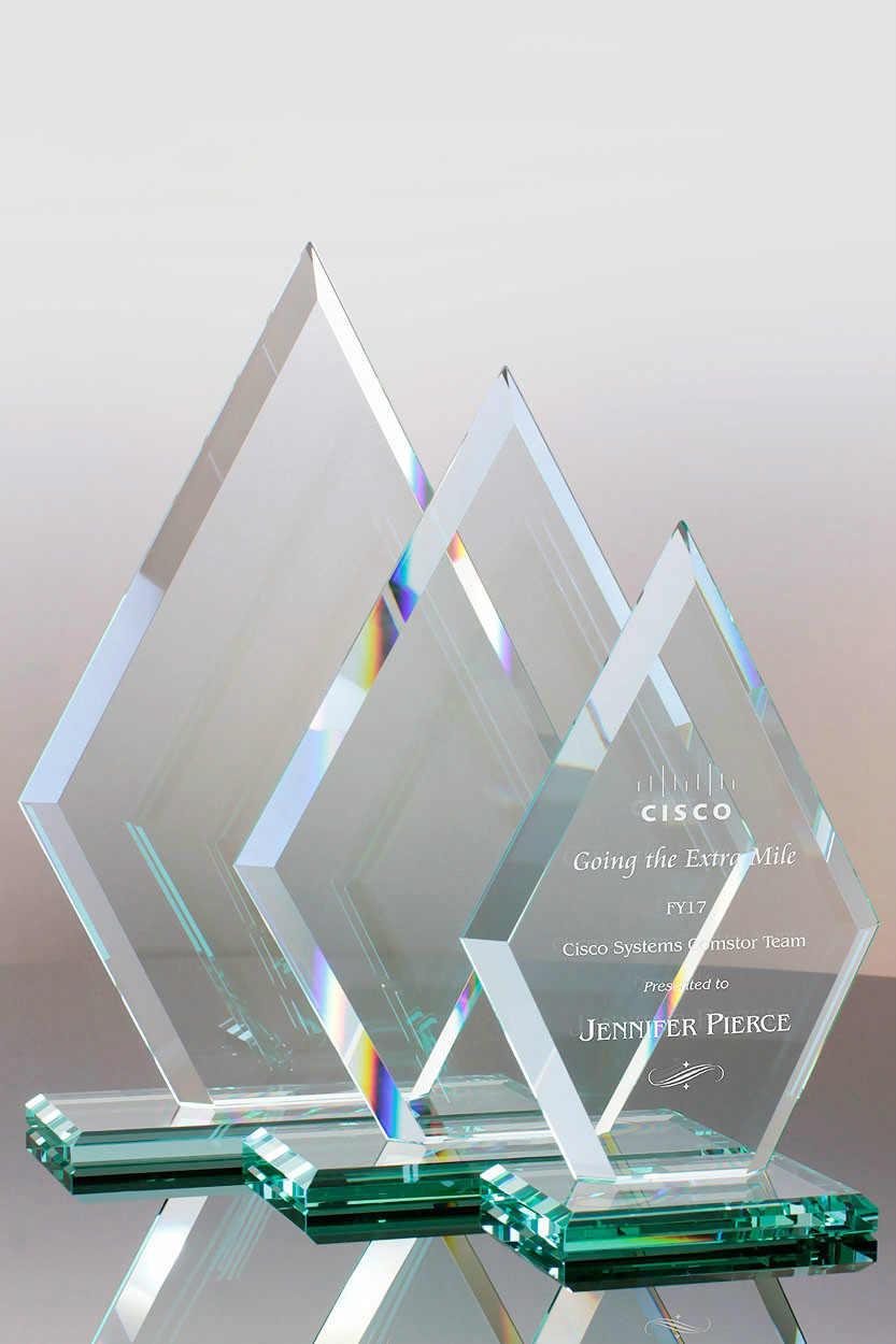 This award is available in three sizes: 8.5", 10.5" and 12.5" tall. It is a great option for award programs that need several sizes for various levels of achievement. The award can be gold or silver filled as well as engraved on both sides of the glass. Ask your Awards Consultant for details.
