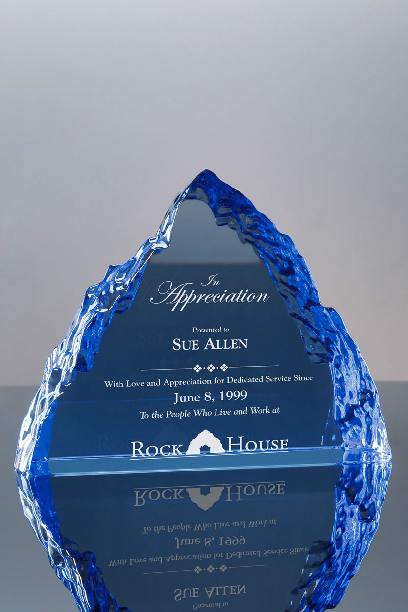 The Mendenhall Award is shaped like a mountain peak, but also resembles a blue iceberg. It is made of optic crystal and stands 5" tall; it's perfect for a team member who is a peak performer, sales "rock star" or has reached their goal or "summit".