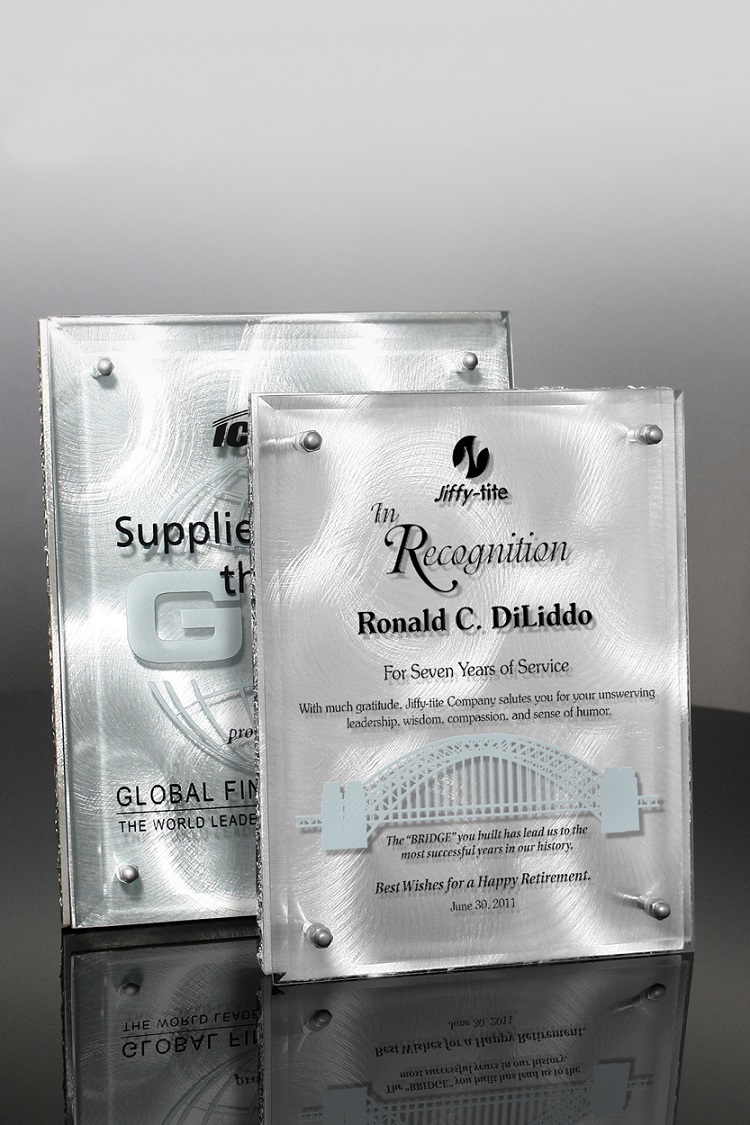 The contemporary Metal Tech Tesla Plaque series features an aluminum back board with a glass panel "floating" above. The aluminum backboard is finished with a decorative circular brush pattern. The glass panel is offset from the backboard with four aluminum pins.