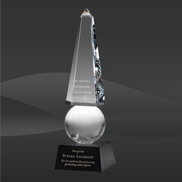 Monumental Crystal Obelisk Award (CBD-OCMO09GZ, CBD-OCMO12GZ, CBD-OCMO15GZ) (Sizes: 9", 12", 15" Tall) Crystal Info: The Monumental Crystal Obelisk Award features a clear crystal obelisk on a round crystal ball, mounted onto a black crystal base.