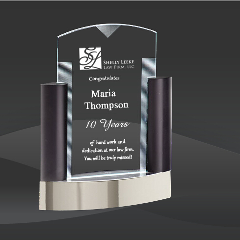 Neopolitan Crystal Award (JC-7006, JC-7007) (Sizes: 8", 9" Tall) Description: The Neapolitan Crystal Award features a traditional yet contemporary neoclassic award that is rich with tone and texture. The silver-plated base reflects light throughout the jade crystal plaque. Comes packaged inside of an elegant blue and silver presentation box.