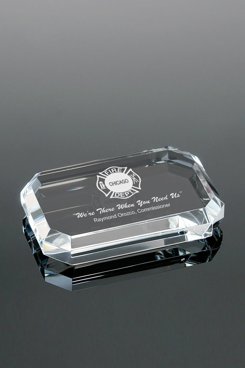 Reminiscent of an emerald cut diamond, the Oblong Gem Cut Crystal Paperweight has a traditional shape that will never go out of style. Make a statement with this beautiful paperweight. Engrave your award text or your corporate logo.