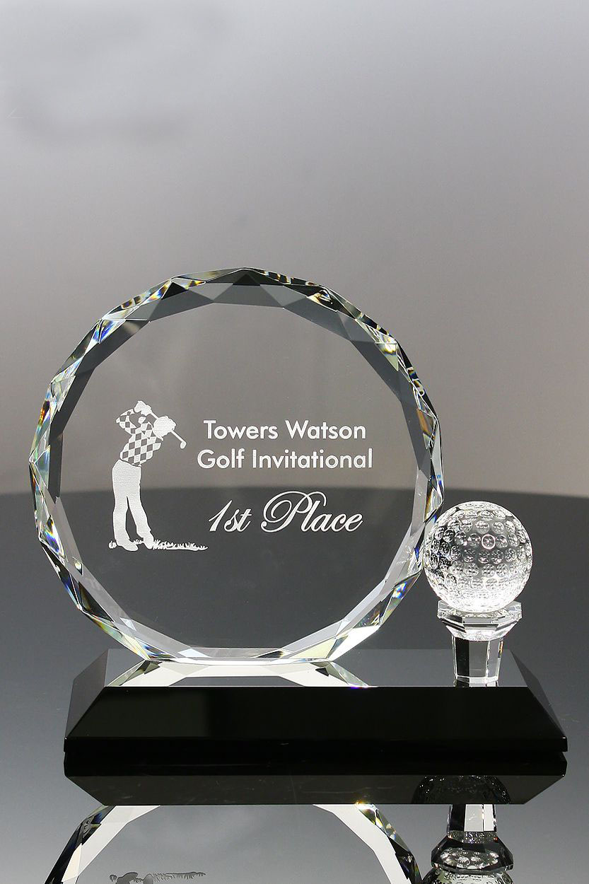 Standing 6.5 inches tall, there is ample engraving space on the main circular crystal component which features many facets to capture and reflect light. The dimpled crystal golf ball sits on crystal tee. Depending on your requirements, it may also be possible to engrave on the black crystal base; please talk with our Customer Service team for options.
