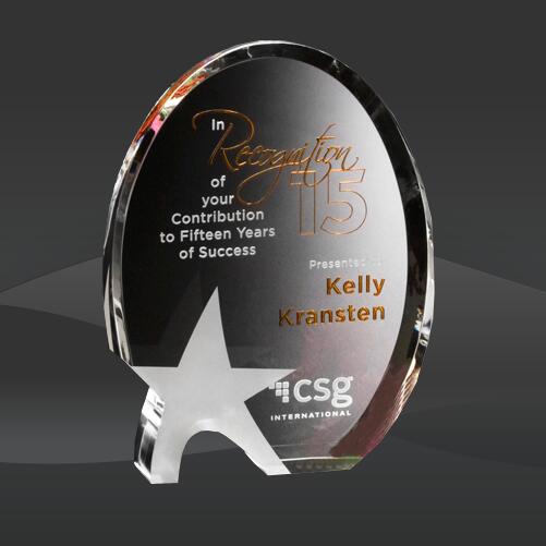 Oval Crystal Star Award (CD-4330, CD-4331, CD-4332) (Sizes: 7", 8", 9" Tall) Product Description: The Oval Crystal Star Award features a oval optical crystal with star etched design at bottom of piece. This award comes in an elegant presentation box.