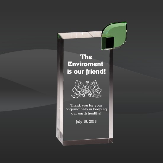Crystal Description: The Leafy Green Award is one of our more popular crystal awards. This crystal tower has a single green leaf mounted on the upper right corner for the 6" size, two leaves for the 8" size, and three leaves for the 10" size. This Crystal Award is shipped in an elegant presentation box.