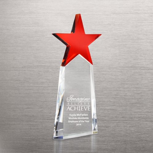 With crisp beveled edges and a brilliant red star to top it off, this crystal trophy is the perfect award for stellar achievements. Comes in a black gift box.