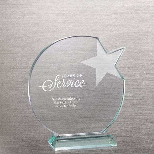 This trophy is made of popular jade glass and highlighted with a frosted star. Each comes in a black gift box.