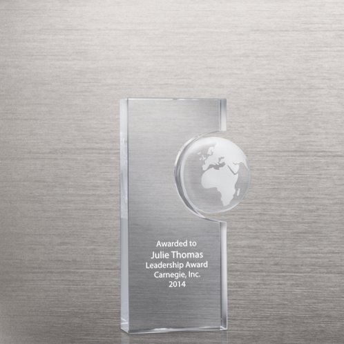 A beautifully etched globe is the focal point of this one-piece, stationary crystal award. This etched crystal trophy is an executive quality award perfect for your top performers. Stands approximately 7" tall. Comes gift boxed and ready to give.