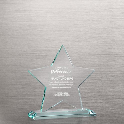 Top-quality trophies have never been so affordable! You can have this premium large star-shaped jade glass award trophy engraved and personalized! Personalization for a special award trophy. Add your custom award sentiment or logo for a free setup.