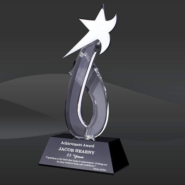 Starshot Crystal Star Award (DMC-DCS310) (Sizes: 10" Tall Only) Achievement Awards Crystal Info: The Starshot Crystal Star Award features a chrome plated silver star with a clear crystal trail and clear crystal accent, mounted onto a black crystal base. Comes with an elegant black presentation case.