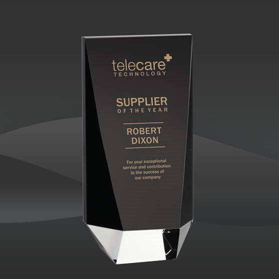 Super Style Black Crystal Wedge Award (STR-OPT8351, STR-OPT8352, STR-OPT8353) (Sizes: 8", 9", 10" Tall) Crystal Info: The Super Style Black Crystal Wedge Award features a unique black crystal wedge mounted onto finely cut clear crystal inlaid base stand. Comes packaged inside of an elegant black presentation case.