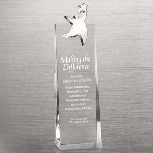Engraved from the back, Personalization for a special award trophy. Add your custom award sentiment or logo for a free setup. Trophy arrives gift boxed and ready to give.