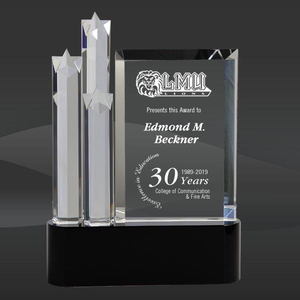 Triple Star Crystal Award (SCT-K5357) (Sizes: 11" Tall Only) Crystal Info: The Triple Star Crystal Award features a three crystal star towers and a rectangle optical crystal, mounted onto a black crystal base. Comes packaged inside of an elegant presentation case.