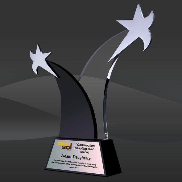 Twisted Crystal Star Award (DMC-DCS346) (Sizes: 11" Tall Only) Crystal Info: The Twisted Star Crystal Award features a clear and black crystal shooting star with aluminum dancing star, mounted onto a black crystal base. Comes with an elegant black presentation case.